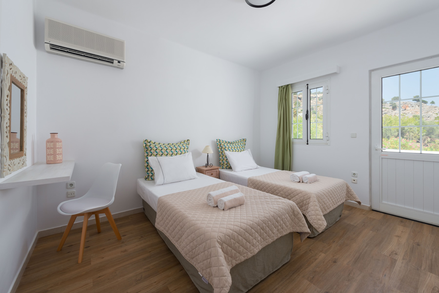 This is the first of the larger villas. From the private driveway, you enter the ground-floor sitting room, with its table, two chairs and a twin sofa bed. Eight steps then lead down to the kitchen and dining area, which has satellite TV. The fully equipped kitchen has a fridge-freezer, full cooker, toaster, kettle and washing machine. From the ground floor, seven steps take you up to a small sitting area with a table and a pull-out twin sofa bed offering extra sleeping space. The double and twin bedrooms leading off this room are both air-conditioned, have spacious wardrobes and adjoining bathrooms, each with a bath/shower and wc. The villa also has Wi-Fi internet and a safe box for your belongings.
