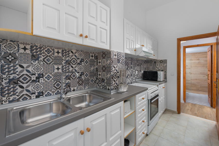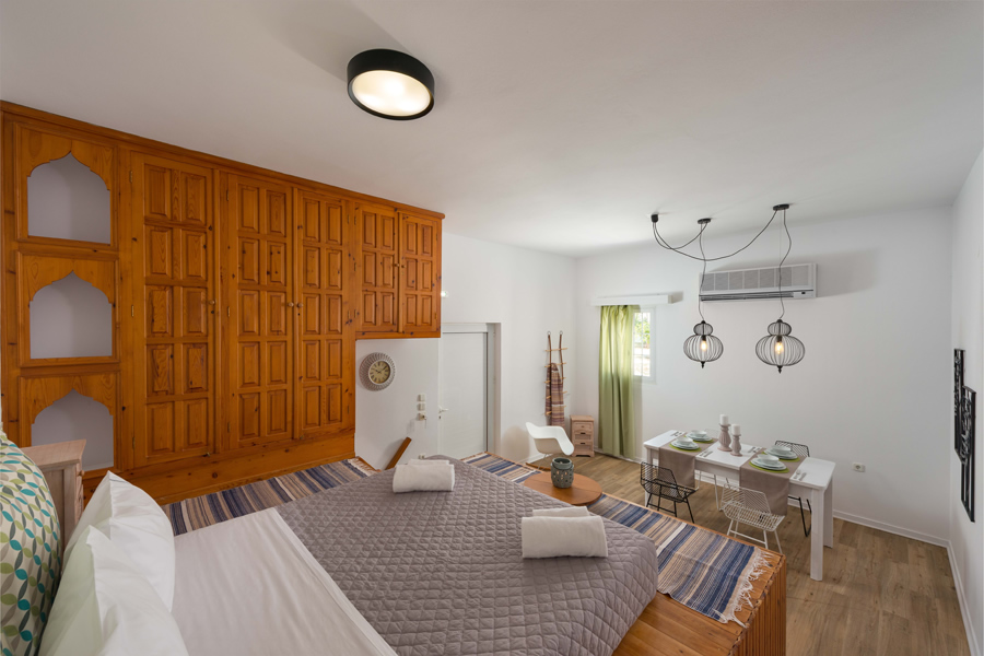As you enter the villa, you will see to your left a sitting and dining area with a couch, chairs . To the right of the entrance is a raised Lindian-style double bed in an air-conditioned area with wardrobe space. Further inside on the same level are a separate bathroom and a separate, fully equipped kitchen with a fridge-freezer, full cooker, toaster, kettle and washing machine. From the entrance A seven-step wooden staircase leads down to the sitting area with a double sofabed the satelite TV and a table. The villa also has Wi-Fi internet and a safe box for your belongings.