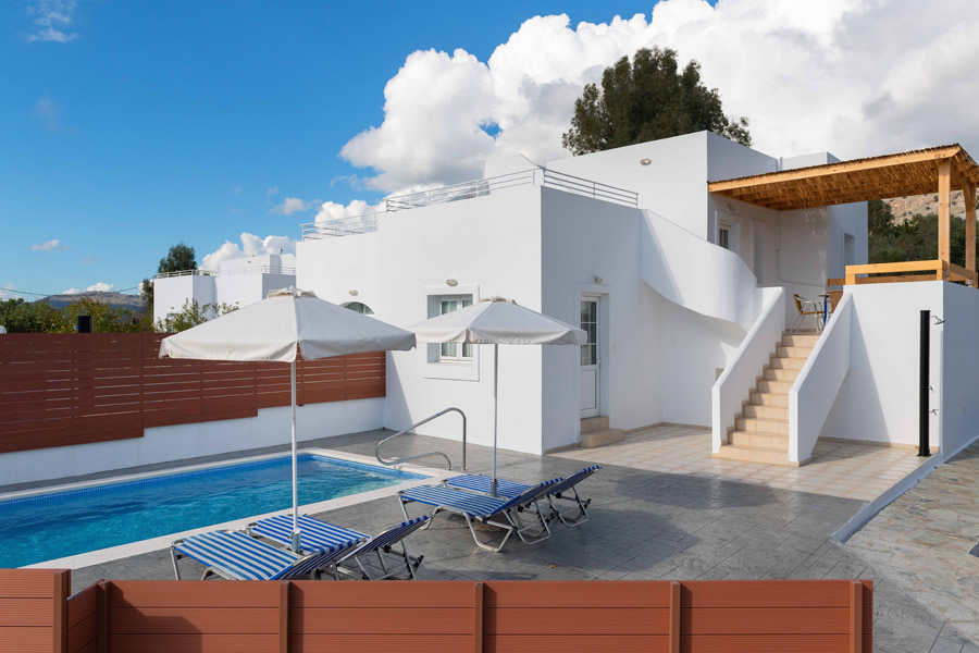The semi-detached Arete and Anastasia villas are almost mirror images of each other. Each villa has a private entrance, parking for two cars and a large garden stocked with plants and trees, as well as a private swimming pool. The double and twin bedrooms in each villa have air-conditioning and spacious wardrobes and each bedroom has a bathroom with a shower/bath and wc. | |||
