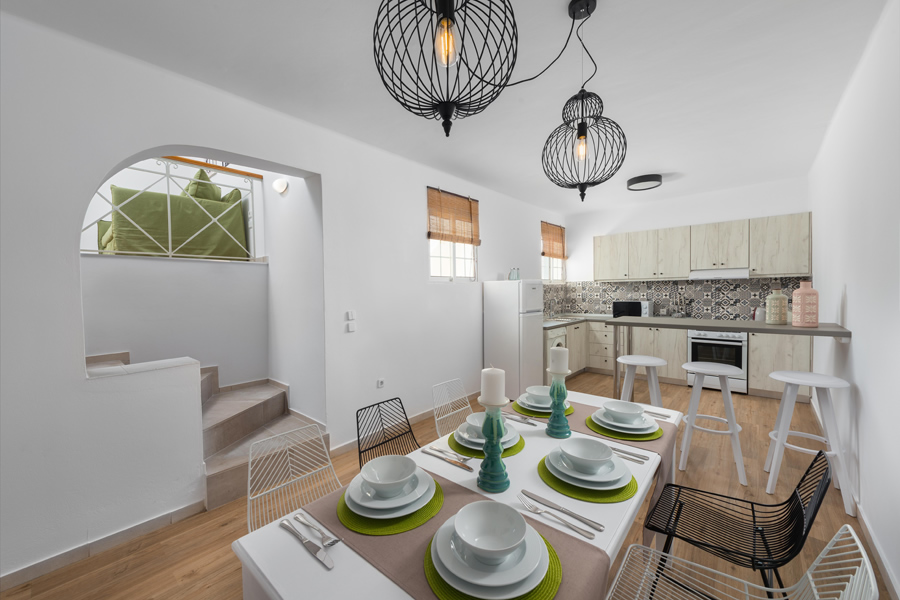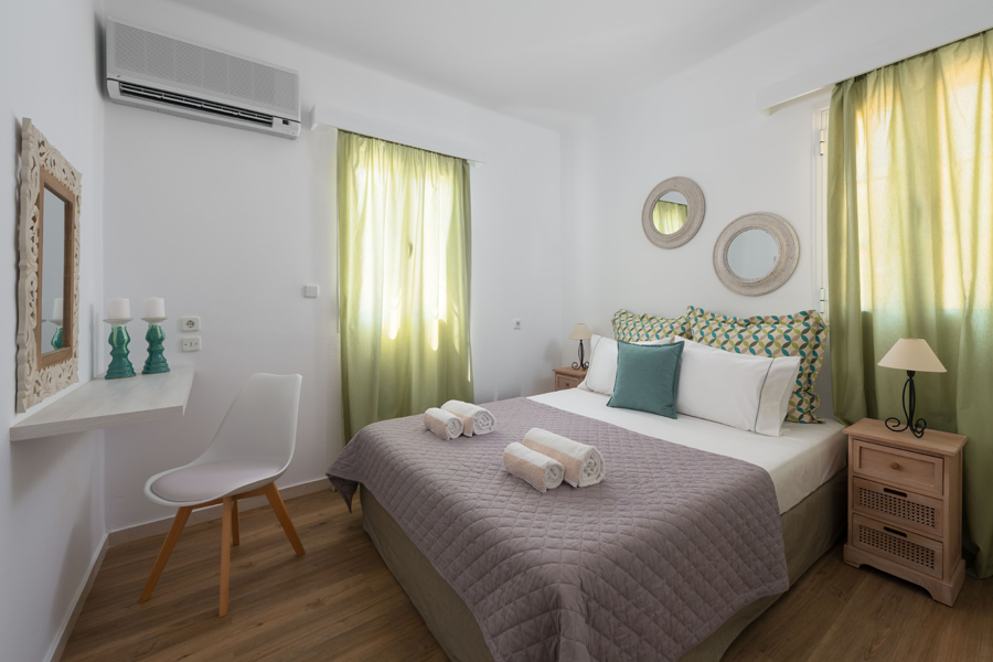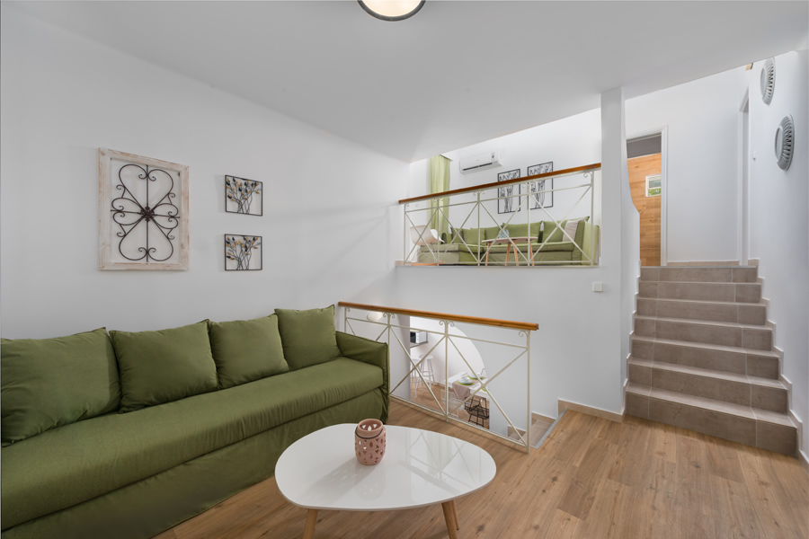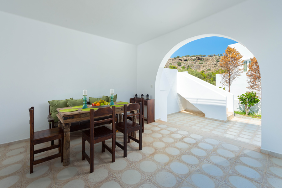 This is the first of the larger villas. From the private driveway, you enter the ground-floor sitting room, with its table, two chairs and a twin sofa bed. Eight steps then lead down to the kitchen and dining area, which has satellite TV. The fully equipped kitchen has a fridge-freezer, full cooker, toaster, kettle and washing machine. From the ground floor, seven steps take you up to a small sitting area with a table and a pull-out twin sofa bed offering extra sleeping space. The double and twin bedrooms leading off this room are both air-conditioned, have spacious wardrobes and adjoining bathrooms, each with a bath/shower and wc. The villa also has Wi-Fi internet and a safe box for your belongings.